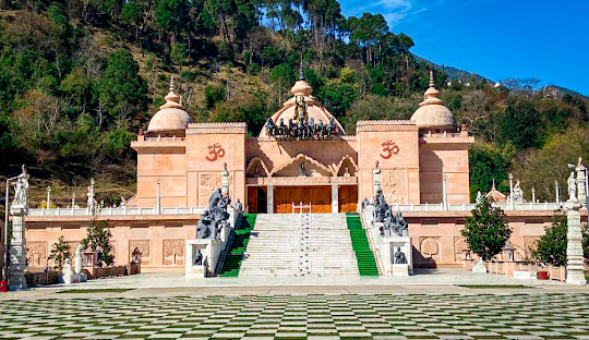 It is set on a hillside with a view of Himachal valley and the foothills of the Himalayas. The complex includes an expansive garden and park with a large Hindu temple at the top. The temple has two large "Om" symbols in the front, and Surya in a seven-horse chariot on the top. The temple features artwork of Hindu legends from the Vedas, the Ramayana and the Mahabharata. Motifs of Indian culture such as elephant, lion, tiger, peacock and river dolphin statues also dot the heritage park. The site includes life-size statues of famed Vedic rishis along with Hindu mythical figures and deities.